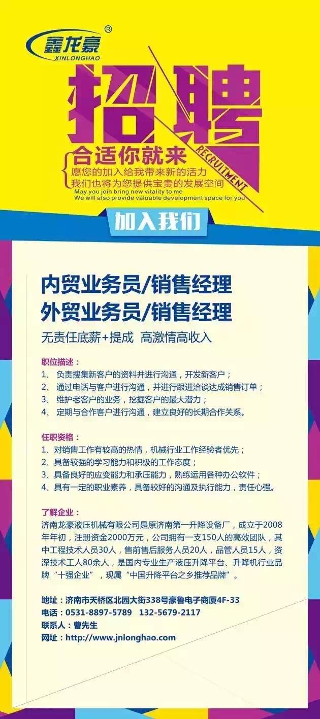 無(wú)責(zé)任底薪+提成,每月輕松收入過(guò)萬(wàn)!龍豪液壓,升降機(jī)的廠家,歡迎你的到來(lái)!